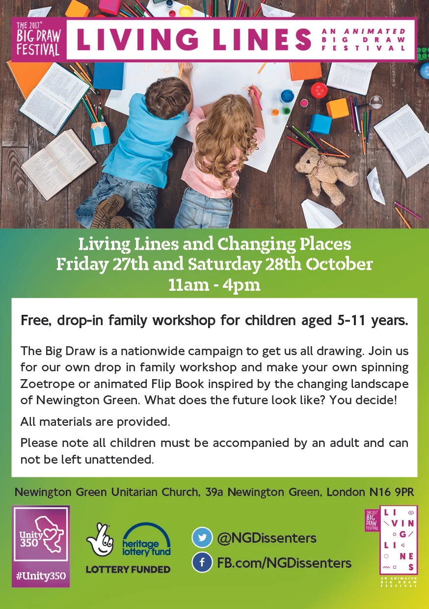 For two days over October half term we invite you, and your family, to drop in to our animation workshop. Join us to make your very own Zoetrope or animated Flip Book inspired by the changing landscape of Newington Green. Look at images and maps of the past and design the Newington Green of tomorrow. What does the future look like? You decide!
